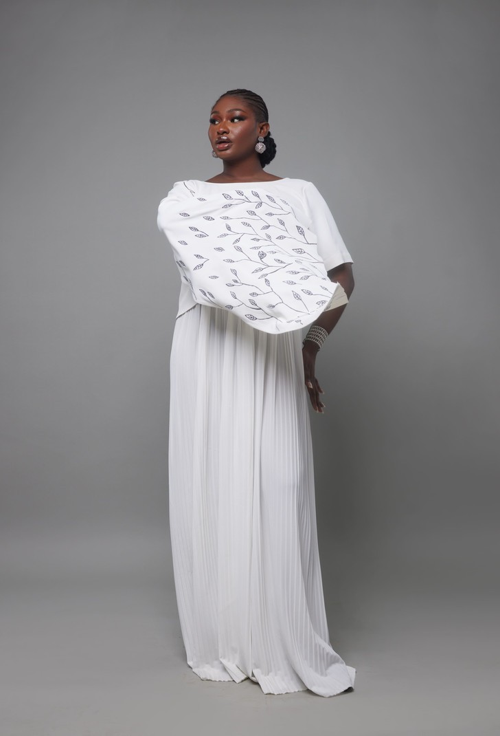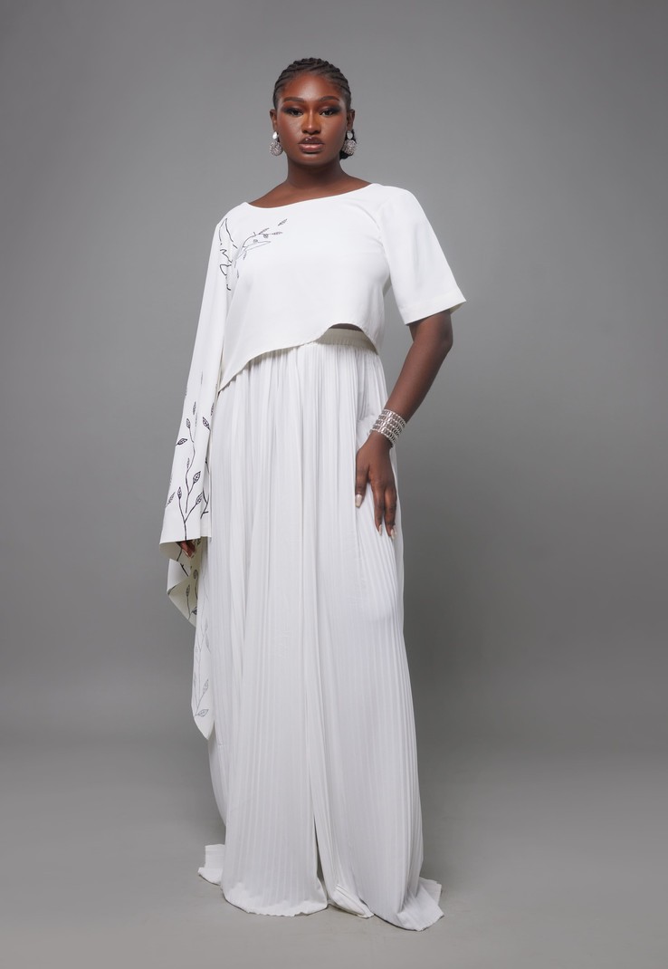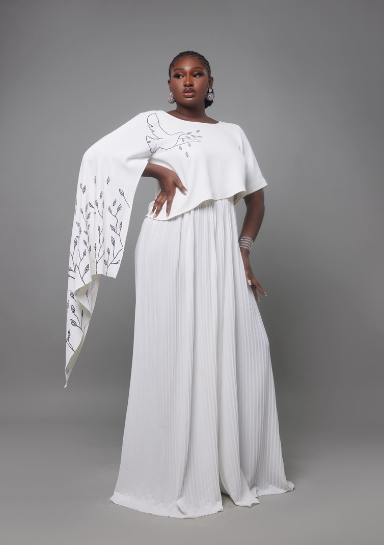 The The Peace Angel Ensemble embodies both fluidity and symbolism. Its asymmetrical crepe crop top is distinguished by a sculptural drape, enhanced with a hand-painted dove, a universal emblem of hope and serenity. Paired with wide-leg crepe trousers, it creates an ethereal and majestic silhouette, at once modern and timeless.