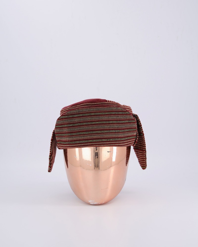 A deep burgundy and earth-toned striped Yoruba traditional cap