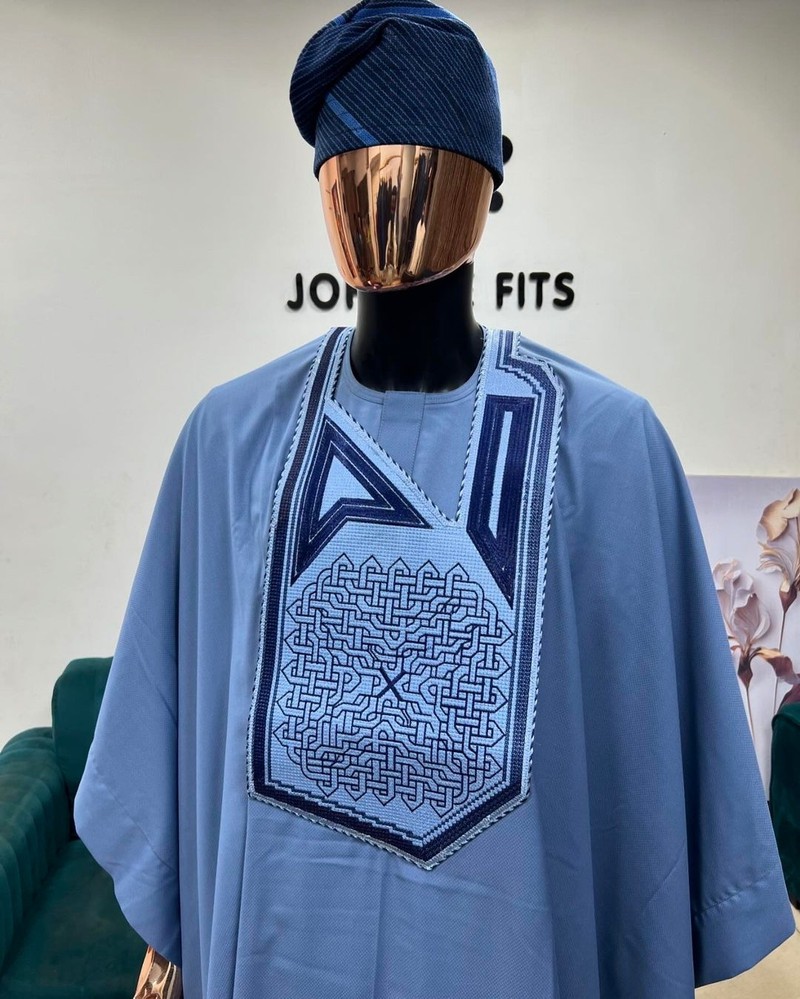 3 pieces agbada sets with a matching pants and a customized hat. You can get the hat customized to your preferred size.. Delivery is within 7 working days