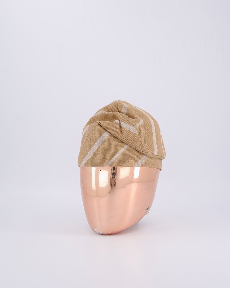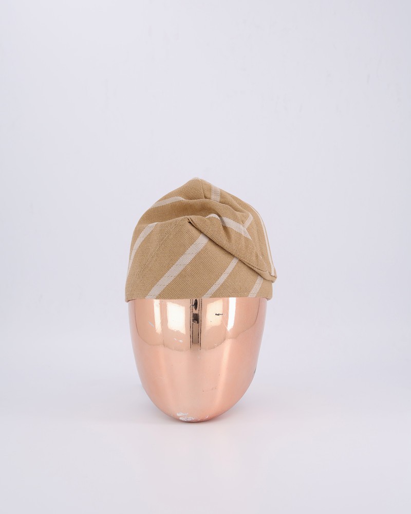 A tortilla-colored Yoruba traditional hat with brown and cream stripes