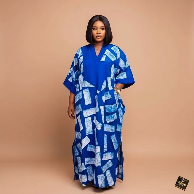 This vibrant cobalt blue maxi Bubu dress is a masterclass in modern African elegance, crafted from high-quality, breathable Adire cotton that offers a structured yet comfortable silhouette. The garment features a bold, geometric pattern of ivory rectangular blocks scattered across a rich blue canvas, creating a dynamic visual rhythm that is both contemporary and culturally rooted. A solid blue band accents the clean V-neckline and sleeve cuffs, providing a tailored finish to the relaxed, oversized fit, while side slits at the hem add a touch of fluid movement. This versatile piece is an excellent choice for chic afternoon garden parties, artistic exhibitions, or sophisticated holiday lounging, offering an effortless transition from cultural celebrations to stylish everyday wear.