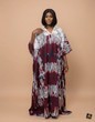 This regal, floor-length boubou dress is expertly crafted from premium hand-dyed batik , offering a breathable and structured silhouette that ensures comfort while maintaining a grand aesthetic. The garment features a deep burgundy and slate-blue abstract patterned base, beautifully contrasted by an intricate, bright white floral lace yoke that extends across the shoulders and V-neckline for a touch of feminine luxury. Its voluminous, free-flowing design provides effortless movement and an airy feel, making it an exceptional choice for high-end cultural ceremonies, wedding receptions, or sophisticated evening events where a blend of traditional craftsmanship and modern elegance is desired.