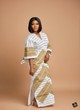 This striking Buba-inspired maxi dress is a masterful blend of traditional texture and contemporary design, expertly crafted from premium Aso-Oke fabric that features a mix of solid weaving and intricate open-work lace detailing. The garment showcases a clean white base accented by bold, diagonal panels of shimmering gold-toned thread, creating a rhythmic visual movement that elevates the classic silhouette. With its relaxed V-neckline, architectural wide sleeves, and elegant side slits for ease of movement, this piece is the ultimate choice for traditional wedding guests, milestone anniversary celebrations, high-profile cultural galas, or any upscale event where you want to embody regal sophistication.