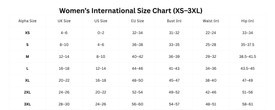 | Int | Chest (incm) | Waist (incm) | Hip (incm) | EU | UK | US |