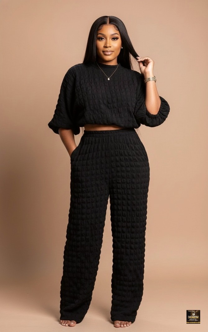 Elevate your casual wardrobe with this ultra-stylish and comfortable two-piece textured lounge set in a rich, earthy black color. The fabric features a distinctive puckered, quilted, or textured finish that adds depth and unique visual interest to the ensemble. The top is a relaxed cropped style with a classic mock neckline and features voluminous, puffed short sleeves that gather slightly at the cuff, offering a fashionable yet relaxed silhouette. The matching high-waisted pants have a comfortable elasticated waistband and fall into a chic wide-leg cut, ensuring unrestricted movement. Practicality is included with side seam pockets on the trousers. This monochromatic set is the definition of elevated comfort, perfect for effortless daytime wear, traveling, or cozy yet stylish weekends.