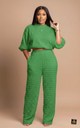 Elevate your casual wardrobe with this ultra-stylish and comfortable two-piece textured lounge set in a rich, earthy green color. The fabric features a distinctive puckered, quilted, or textured finish that adds depth and unique visual interest to the ensemble. The top is a relaxed cropped style with a classic mock neckline and features voluminous, puffed short sleeves that gather slightly at the cuff, offering a fashionable yet relaxed silhouette. The matching high-waisted pants have a comfortable elasticated waistband and fall into a chic wide-leg cut, ensuring unrestricted movement. Practicality is included with side seam pockets on the trousers. This monochromatic set is the definition of elevated comfort, perfect for effortless daytime wear, traveling, or cozy yet stylish weekends.