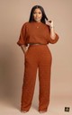 Elevate your casual wardrobe with this ultra-stylish and comfortable two-piece textured lounge set in a rich, earthy orange color. The fabric features a distinctive puckered, quilted, or textured finish that adds depth and unique visual interest to the ensemble. The top is a relaxed cropped style with a classic mock neckline and features voluminous, puffed short sleeves that gather slightly at the cuff, offering a fashionable yet relaxed silhouette. The matching high-waisted pants have a comfortable elasticated waistband and fall into a chic wide-leg cut, ensuring unrestricted movement. Practicality is included with side seam pockets on the trousers. This monochromatic set is the definition of elevated comfort, perfect for effortless daytime wear, traveling, or cozy yet stylish weekends.