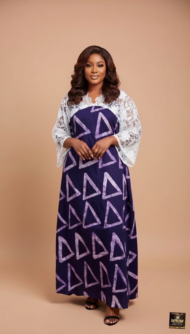 A beautiful fusion of traditional print and modern style. This purple and white maxi dress showcases a bold, graphic triangle Adire print on the skirt. The bodice and statement bell sleeves are crafted from delicate white lace, providing a soft, feminine contrast. Perfect for family gatherings, naming ceremonies, or as stylish day-wear.