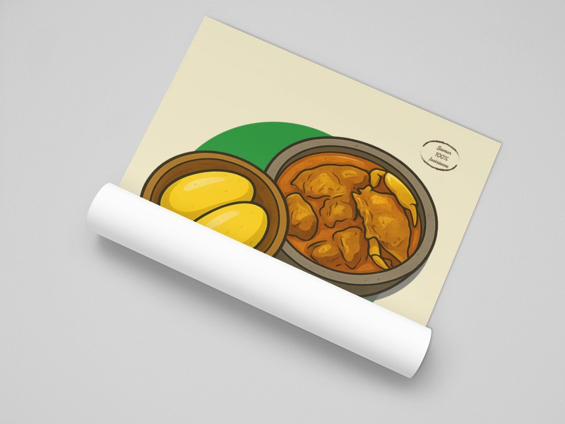 Plat national par excellence, le Foutou Sauce Graine incarne la générosité de la cuisine ivoirienne. Cette illustration met en lumière l’alliance du foutou (banane ou igname pilée) et de la sauce graine onctueuse, dans un style graphique pop qui sublime cette richesse culinaire avec éclat.