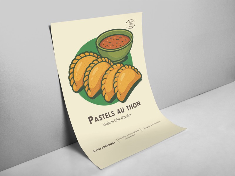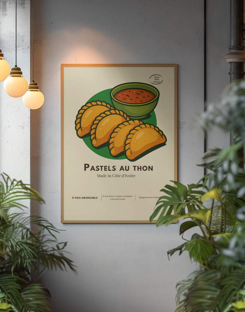 Les pastels au thon, petits chaussons frits aux bords dorés, sont de véritables trésors croustillants de la street food ouest-africaine. Illustrés ici dans une version graphique rétro-pop, ils prennent une nouvelle dimension décorative, à la fois gourmande et esthétique.