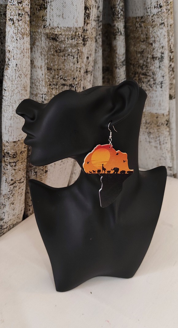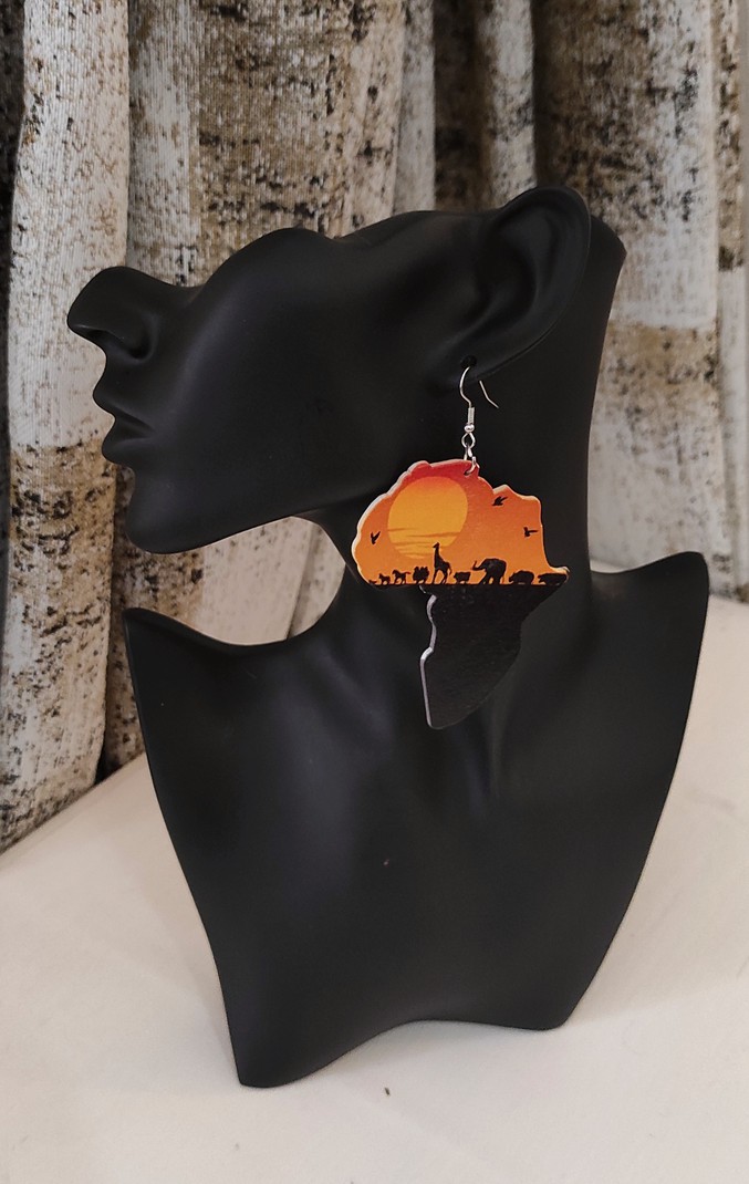 The beautiful Africa Earrings feature the map of Africa with some drawings of the African jungle and animals that are found in Africa.