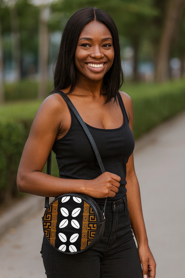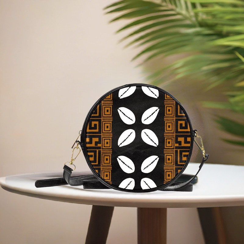 Experience the rich culture and style of Africa with our African Bag Round Sling Cowrie Print. This unique bag features a beautiful cowrie print and a round sling design, perfect for carrying your essentials while making a statement. Made with high-quality materials, this bag is both stylish and durable.