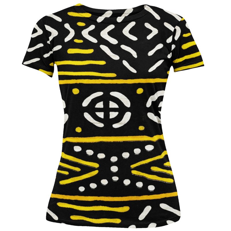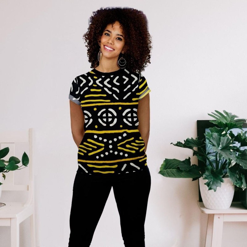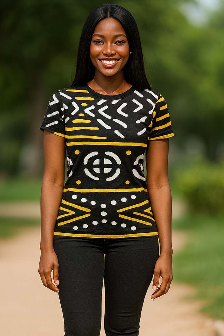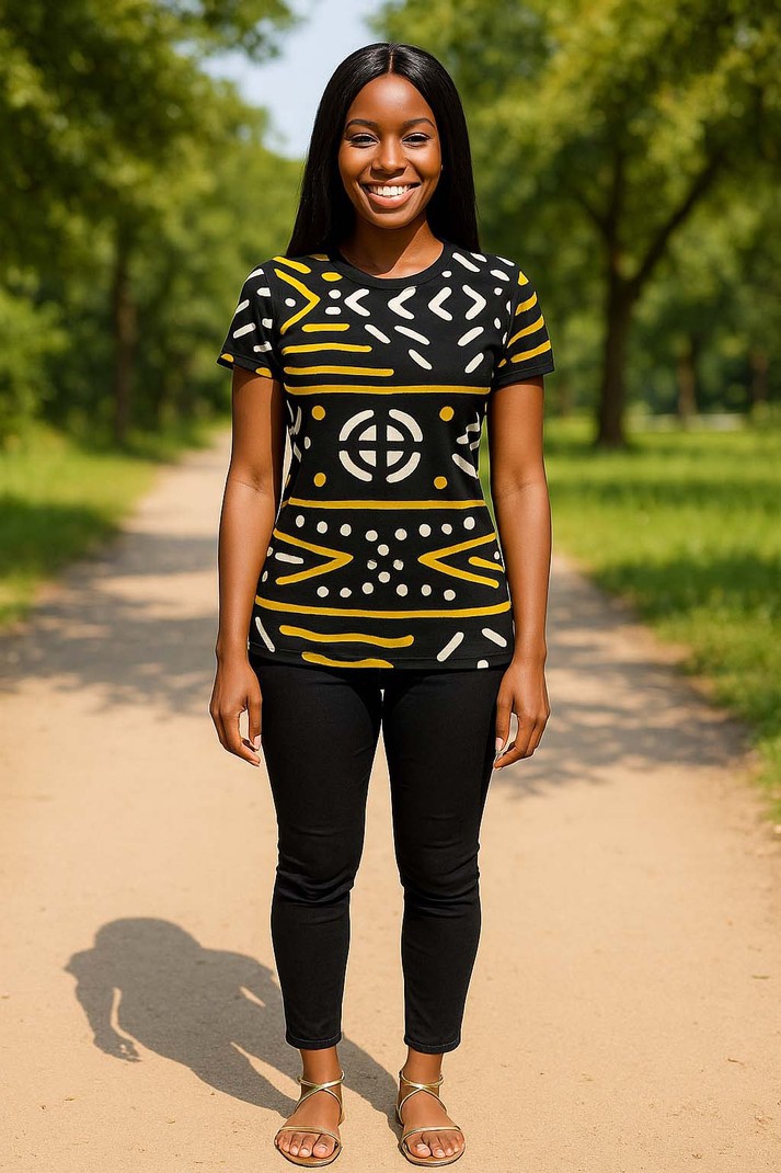 Celebrate your heritage with the African Bogolan Afrocentric T Shirt, a stylish blend of tradition and modern fashion that connects you to African artistry. Product Features Please Compare your Measurements To our Size Chart This T-shirt is Designed for fashionable women. Made from 5.47 Oz. 100% polyester. Double-needle hemmed sleeves and bottom. Vivid print that will never fade after washing Soft, lightweight and quick drying. Delivery Time This item will be processed within 3-7 business days (Excluding Weekends and Holidays). Once products ships it can take up to 15 Business days depending on your location. Out of Stock items can be requested by emailing us at [email protected] Care Instructions Machine wash cold inside out. Gentle cycle with mild detergent and like colors. Do not use bleach or fabric softener. Do not tumble dry. Hang to dry to ensure maximum shelf life. Iron inside out if necessary. Do not iron the print. Do not dry clean.