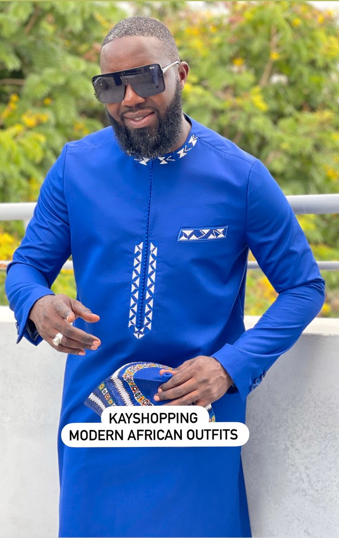Blue African Suit sewn with wool. Embroidery pattern with button threads. Production time 15 days