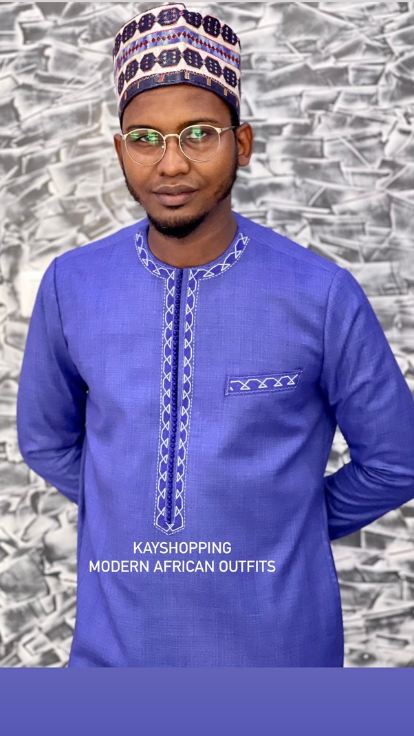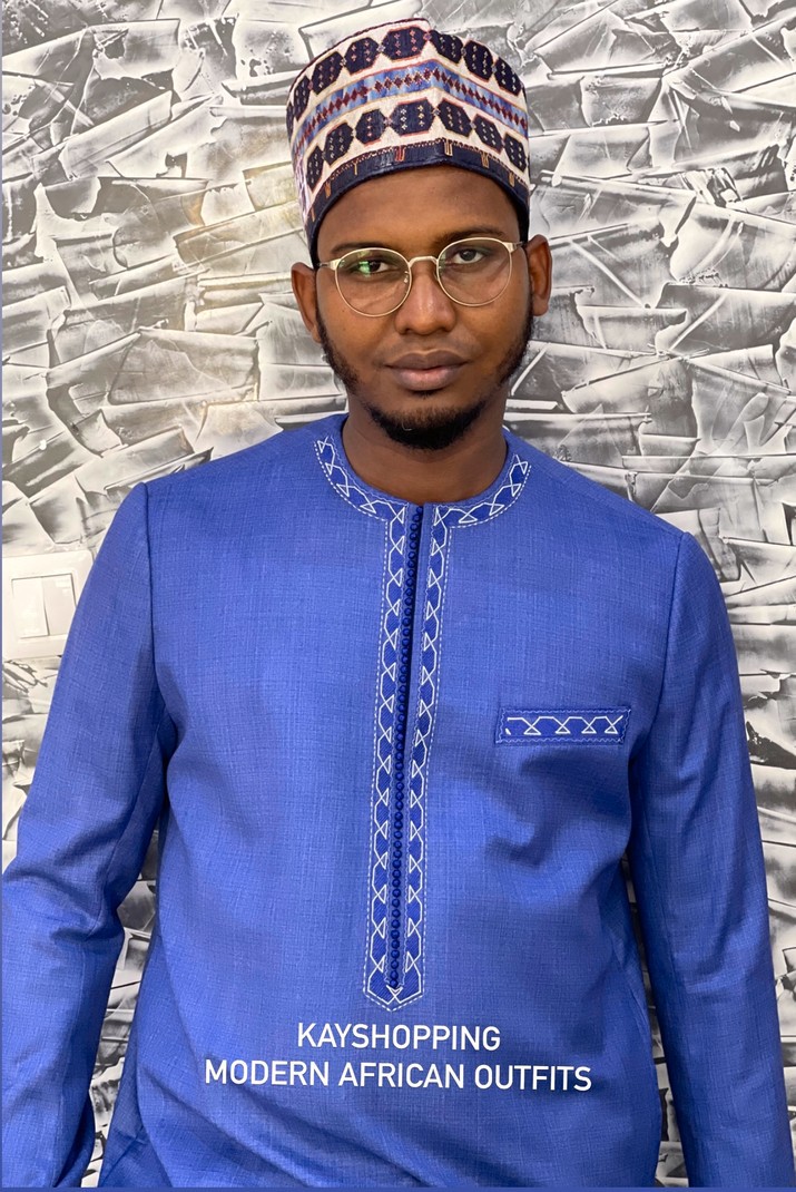 Blue African Suit sewn with wool. Tone-on-tone embroidery pattern Tailoring time 15 Days