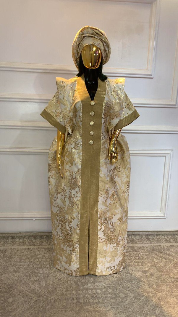 It comes paired with a matching headpiece to complete the look, making it a satement of heritage, grace, and luxury, designed to celebrate African fashion in all its splendor.