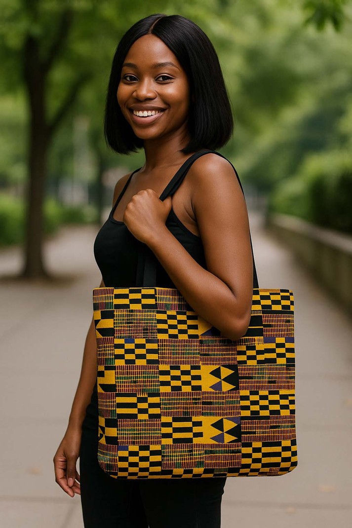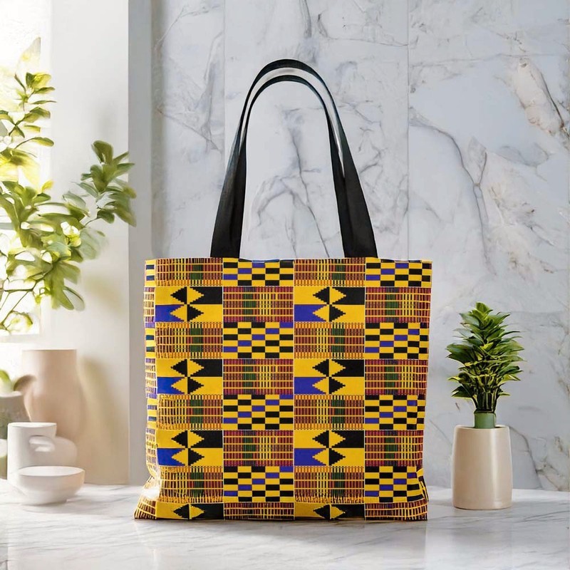Take on the world with our African Kente Cloth Bag Tote! Featuring a bold Ghana print, this minimalist bag is perfect for those who like to take risks. With a large capacity, it's perfect for all your adventures. Embrace the challenge, embrace the adventure! Product Description • 510 g/m2. Made from high-grade canvas. • Durable and roomy enough for your daily items. • Lightweight canvas tote bag with sturdy handle is easy to carry. • Perfect for shopping and carrying your essentials. Delivery Time This item will be processed within 3-7 business days (Excluding Weekends and Holidays). Once products ships it can take up to 15 Business days depending on your location. Out of Stock items can be requested by emailing us at [email protected] Care Instructions Machine wash cold inside out. Gentle cycle with mild detergent and like colors. Do not use bleach or fabric softener. Do not tumble dry. Hang to dry to ensure maximum shelf life. Iron inside out if necessary. Do not iron the print. Do not dry clean.