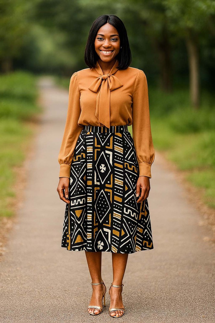 Unleash your adventurous spirit with our African Skirt Style Mudcloth Print! This midi length skirt is flared for a bold and dynamic look. Embrace the challenge of standing out in this unique and eye-catching piece. Perfect for those who love to take risks and make a statement. Order now!