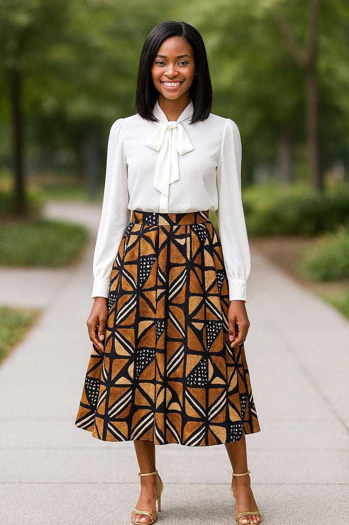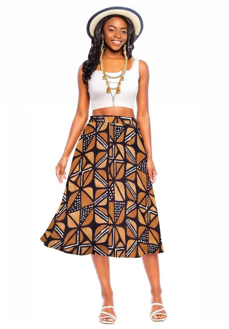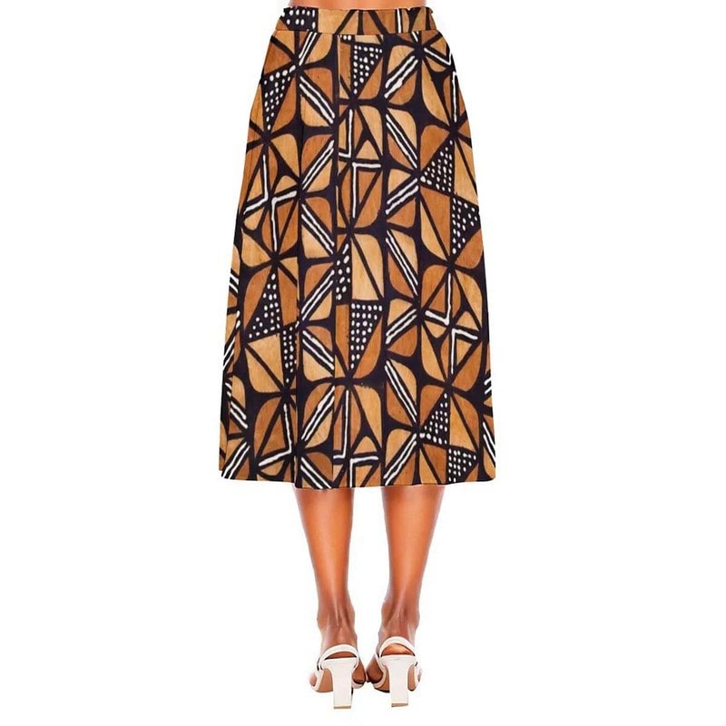 Unleash your inner adventurer with our Bogolan Afrocentric Skirt Flared! This daring flared midi length skirt features a bold geometric pattern inspired by traditional African clothing. Step out of your comfort zone and make a statement with this unique and eye-catching piece.