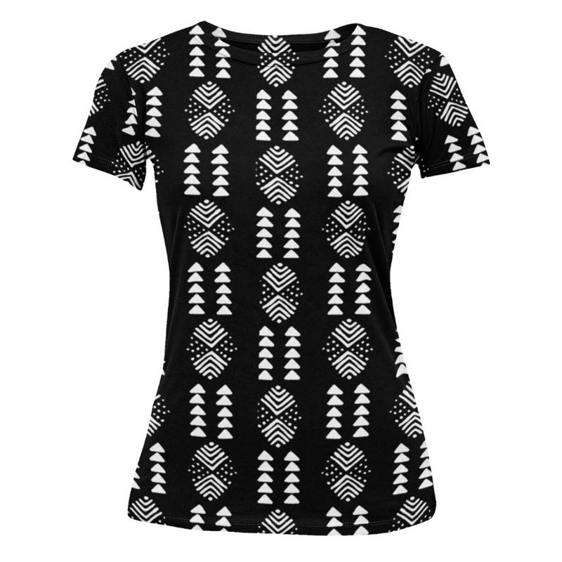 This Afrocentric T-shirt in Tribal Print for Women adds a splash of color and prints to your wardrobe. It features a unique pattern of African tribal prints, making it a statement piece. It will make you stand out while expressing your personal flair. Product Features Please Compare your Measurements To our Size Chart This T-shirt is Designed for fashionable women. Made from 5.47 Oz. 100% polyester. Double-needle hemmed sleeves and bottom. Vivid print that will never fade after washing Soft, lightweight and quick drying. Delivery Time This item will be processed within 3-7 business days (Excluding Weekends and Holidays). Once products ships it can take up to 15 Business days depending on your location. Out of Stock items can be requested by emailing us at [email protected] Care Instructions Machine wash cold inside out. Gentle cycle with mild detergent and like colors. Do not use bleach or fabric softener. Do not tumble dry. Hang to dry to ensure maximum shelf life. Iron inside out if necessary. Do not iron the print. Do not dry clean.