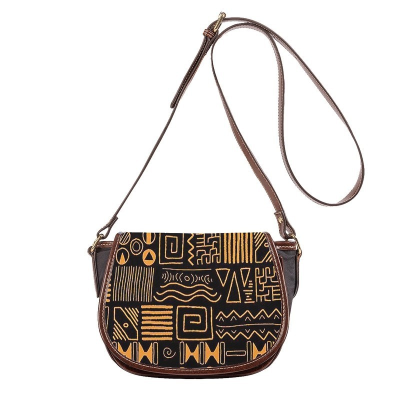Take on the world with this bold and adventurous Afrocentric Tribal Print Crossbody Bag! Featuring a stunning mudcloth design and a convenient saddle style, this bag is perfect for any daring individual. Carry your essentials with confidence and style in this unique and eye-catching accessory.