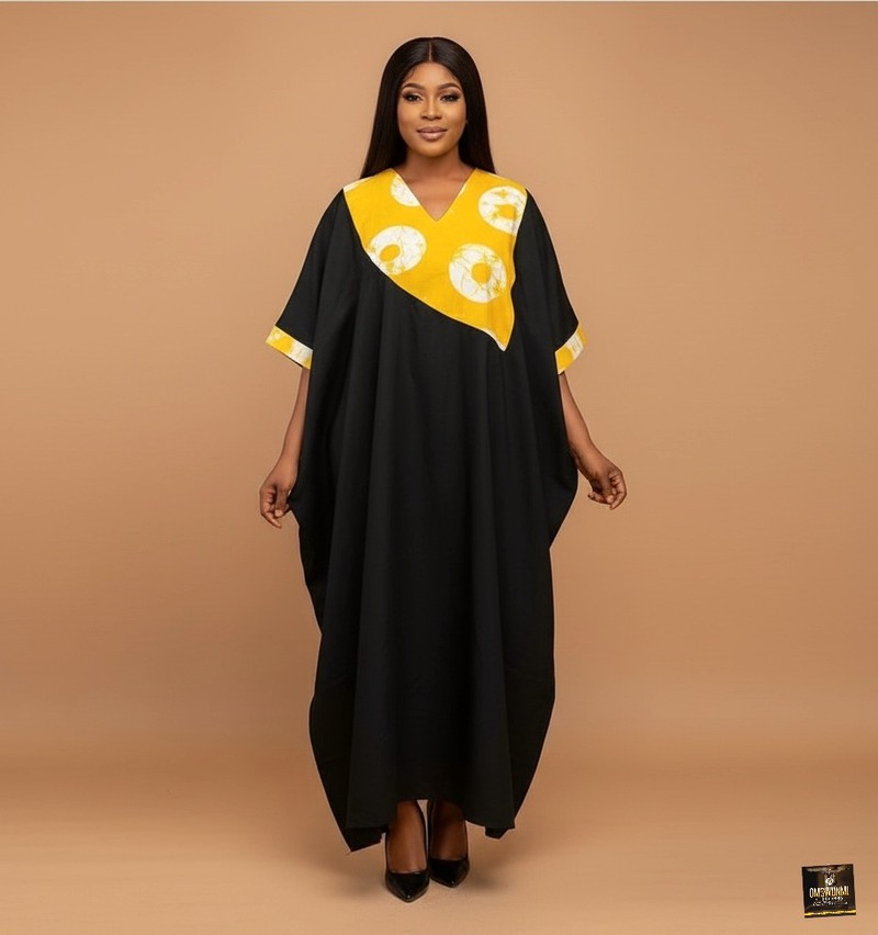 Experience luxurious comfort and regal style with the effortlessly elegant maxi kaftan dress. The sweeping, voluminous silhouette is designed in a deep, classic black, providing a beautiful contrast to the bold, patterned yoke. This front panel features a striking V-neck design in a lively yellow-and-white print with contemporary abstract circle motifs, suggesting a rich African-inspired textile influence. The fluid drape of the lightweight fabric ensures maximum comfort and a sophisticated movement, making it ideal for resort wear, cultural gatherings, or relaxed yet polished evening entertaining.