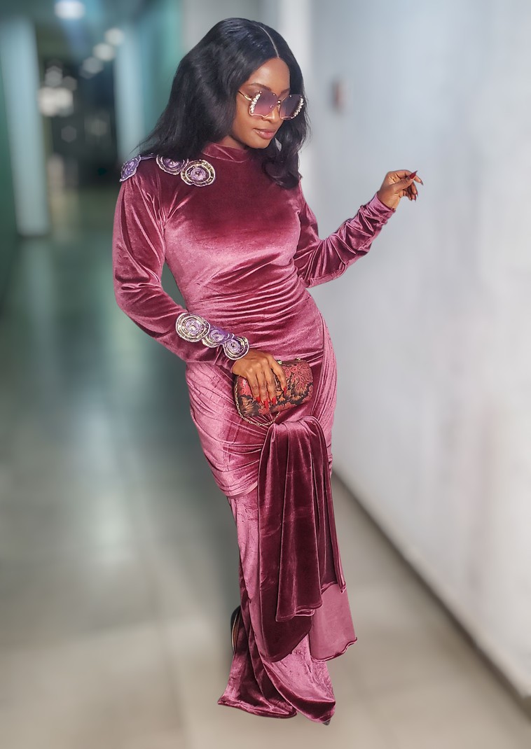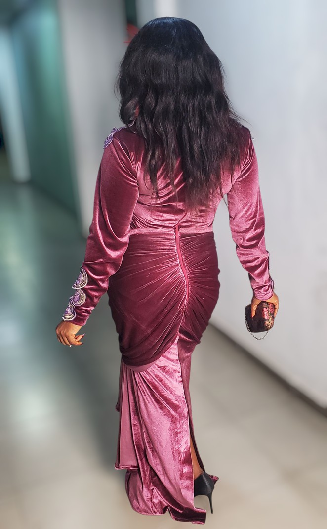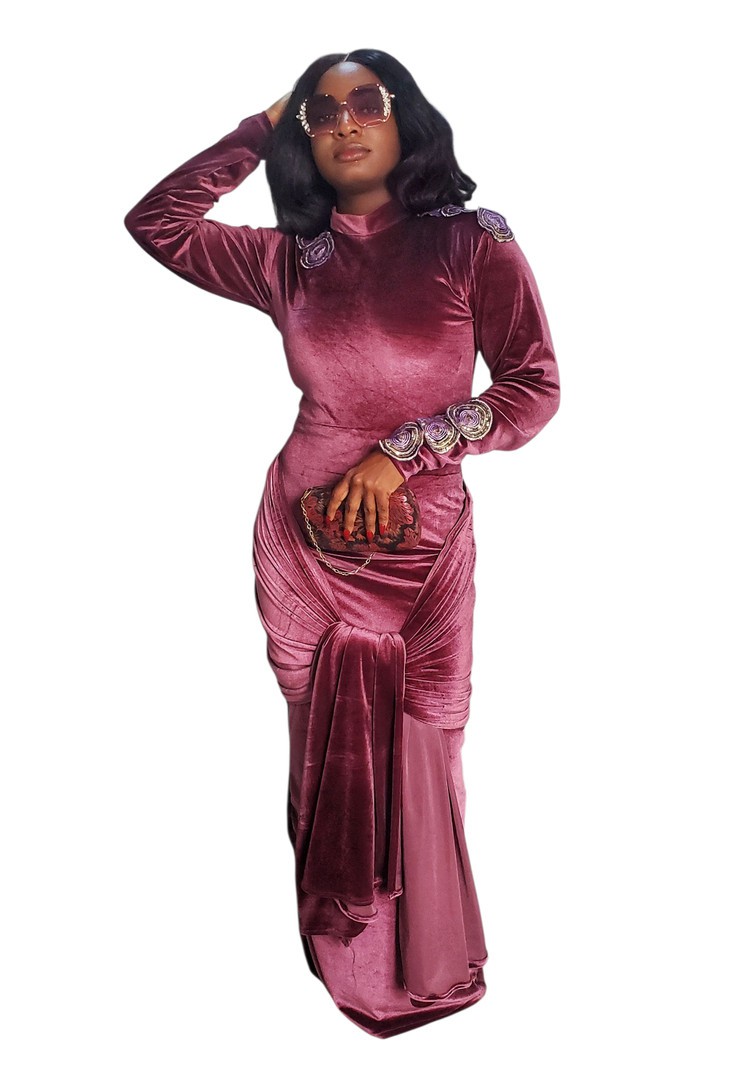 The dress is designed as a high-neck long-sleeve fitted long dress with a sash and ruched behind. It features a zipper at the back. The shoulders and arms are embellished with rare velvet sequin cut-outs.