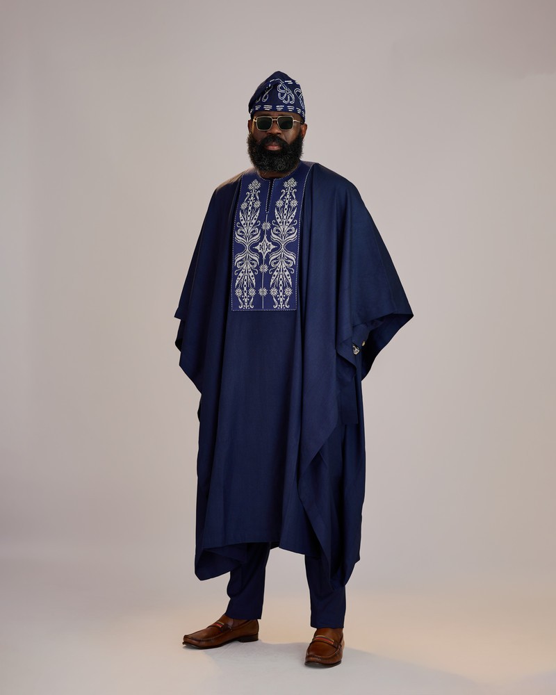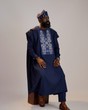 Draped in Royal Midnight, this agbada whispers calm dominance and sharp intellect. The kaftan’s chest carries the Òpẹ́ Ọba embroidery — an intricate ivory vine work that blooms like a king’s blessings, weaving prestige into every stitch. The matching fila seals the look with cultural pride, a crown for the man whose presence commands without noise.