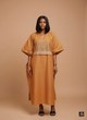 This beautifully textured maxi kaftan is a piece of understated elegance, perfect for achieving a sophisticated, relaxed aesthetic. The dress is rendered in a warm, earthy tone of rich burnt orange, featuring a subtle, woven texture across the entire fabric that adds depth and tactile interest to the garment. Its silhouette is a traditional kaftan cut, offering a generous, flowing fit with comfortable wide sleeves and a simple V-neckline that extends gracefully to the ankle. A key design detail is the contrasting yoke panel across the chest, which features a tightly woven, neutral-toned fabric, possibly raffia or woven cotton, finished with a delicate layer of fringing that introduces a textural, artisanal element and defines the neckline. This full-length dress offers exceptional comfort and timeless style, celebrating texture and rich, warm coloration.