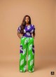 This striking two-piece set features a dynamic and vibrant mix-and-match look, with the top and trousers presenting different yet complementary bold African prints. The top is designed in a rich purple fabric with oversized green and white leaf motifs, cut with an elegant, gathered round neckline and short, puffed sleeves, cinched at the natural waist by a broad, ruched purple band for a flattering fit. The coordinating trousers are crafted in an electrifying bright green fabric, also adorned with white leaf patterns, and feature a comfortable elastic waistband, a relaxed wide-leg cut, and large patch pockets that are uniquely accented with panels of the same purple leaf print used on the top, resulting in a cohesive, spirited, and fashionable ensemble.