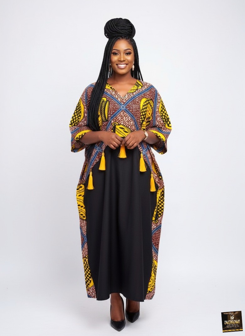 Embrace elegance and culture with this stunning Ankara kaftan gown. Crafted with a mix of bold African prints in brown, yellow, and blue hues, this loose-fitting dress offers both comfort and sophistication. It features eye-catching yellow tassel accents along the front and sides, adding a playful yet regal touch. Perfect for casual outings, cultural events, or festive celebrations, this gown is designed to make you stand out effortlessly.