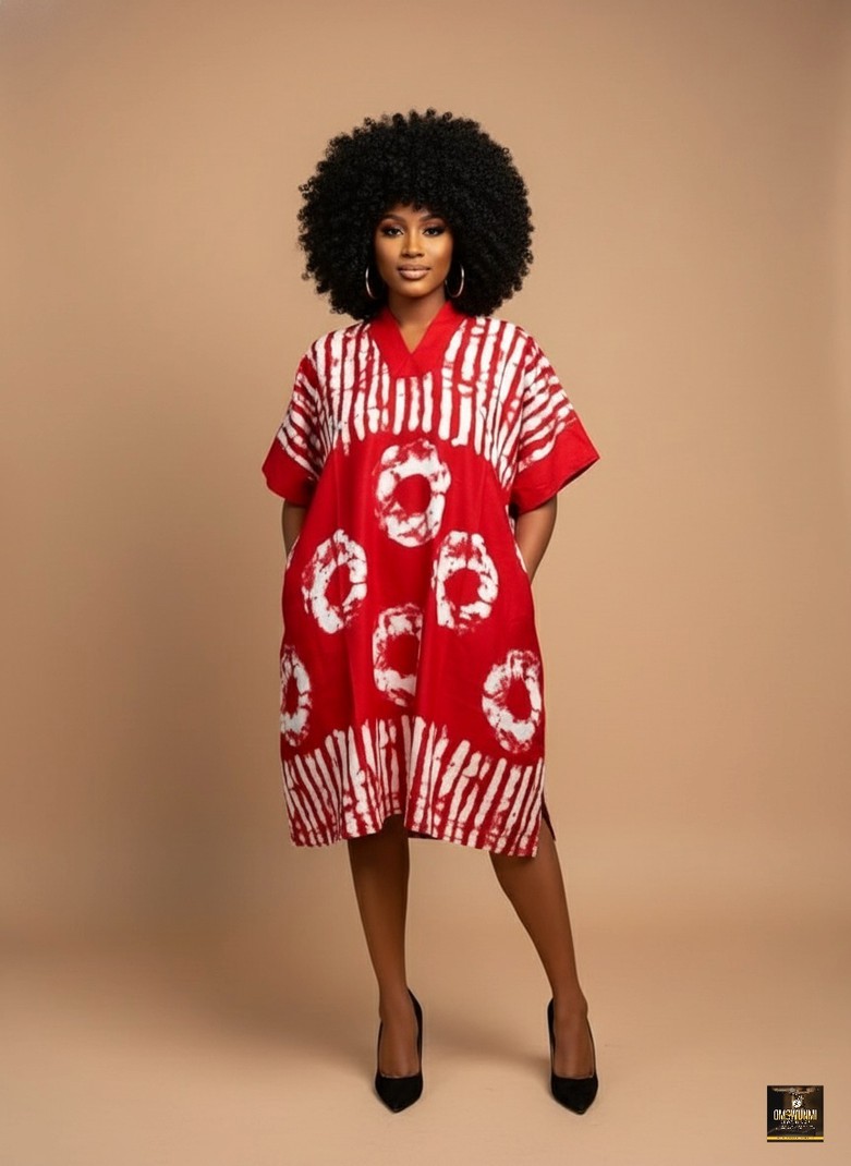 This radiant red dress is elevated by hand-dyed white circular patterns, forming a dynamic and expressive design. The soft cotton fabric and airy cut ensure freedom and ease, making it ideal for warm-weather elegance. Simple yet striking, it embodies the perfect blend of tradition and contemporary flair.