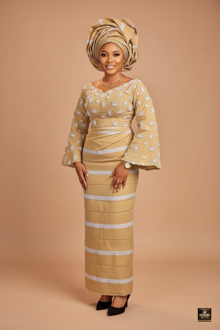 An epitome of sophisticated grace. This stunning full-length dress is crafted from shimmering light gold/tan Aso Oke with delicate, embroidered silver floral detailing across the bodice and the flared bell sleeves. The skirt features bold, wide horizontal silver striped panels set against the gold background, creating a statuesque and slimming effect. It is paired with a meticulously tied, matching Gele (headwrap), this look is ideal for high-status events like weddings and major anniversaries.