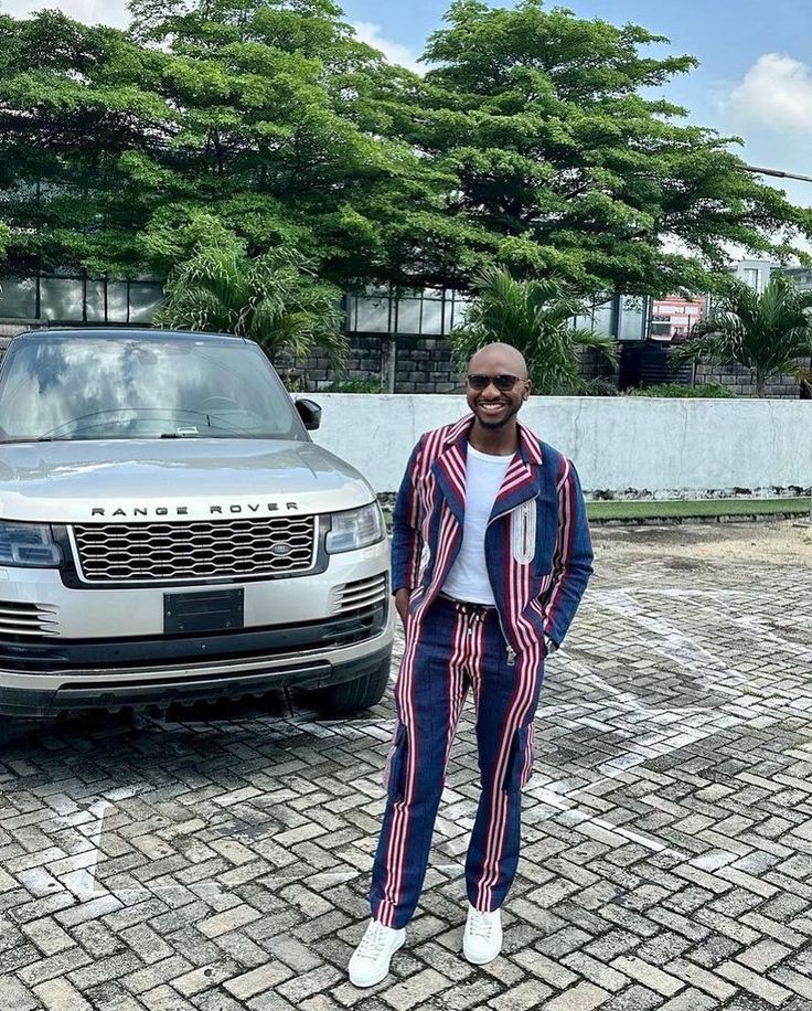 The jacket is worn over a plain white T-shirt, which balances the boldness of the stripes.