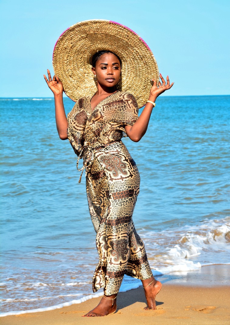 Loose-fit slit pants / tunic with gold, brown and black print. These pants can be worn in two ways: -As pants with a bow at the waist and slit on the sides. -As a jumpsuit with a bow at the waist.