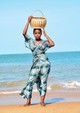 -Ainsi qu'en combinaison pantalon avec un noeud à la taille et manche cloche.