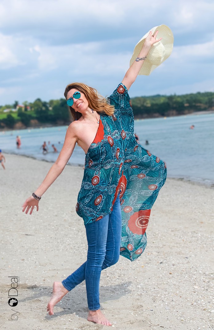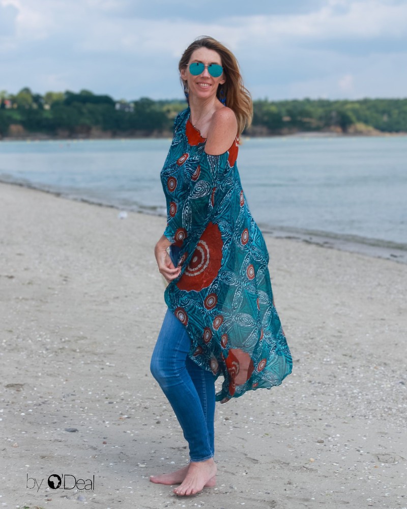Adopt this asymmetrical tunic in bogolan printed silky muslin for a chic and elegant look. In town or at the beach, day or night, you will not go unnoticed! Its original cut and cheerful patterns will seduce you. Material: bogolan printed muslin Fall in love and make a sensation! Bogolan patterns are random and not always exactly as pictured.