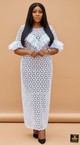 This sophisticated floor-length gown is meticulously crafted from intricate white eyelet lace, featuring a rhythmic circular geometric pattern that offers a beautiful play on texture and transparency. The design is characterized by its graceful, form-fitting silhouette and romantic multi-layered ruffled sleeves, which add a touch of dramatic volume to the upper arms. Complemented by a signature gold chain wristwatch and classic black pumps, this pristine white ensemble is an exceptional choice for prestigious "all-white" garden parties, elegant bridal showers, or high-profile religious celebrations where a blend of modest refinement and contemporary artisanal detail is required.