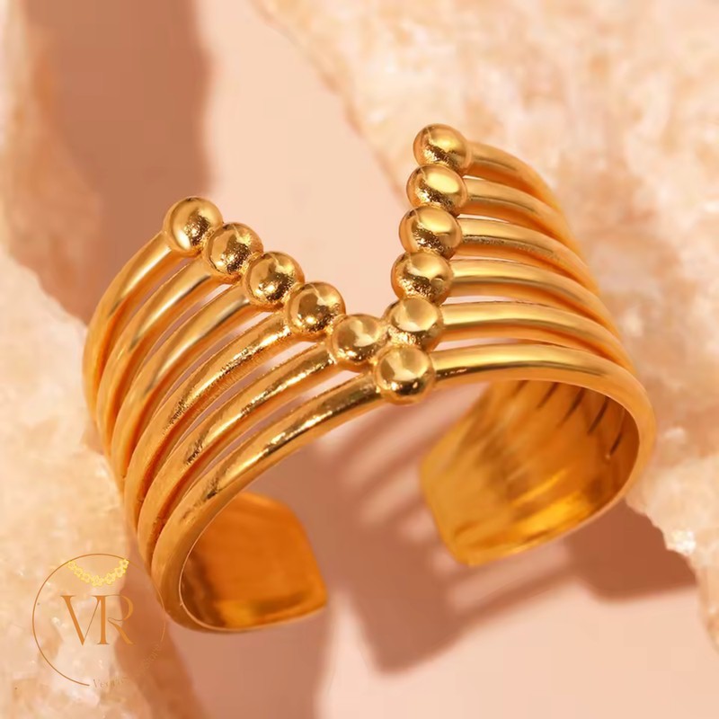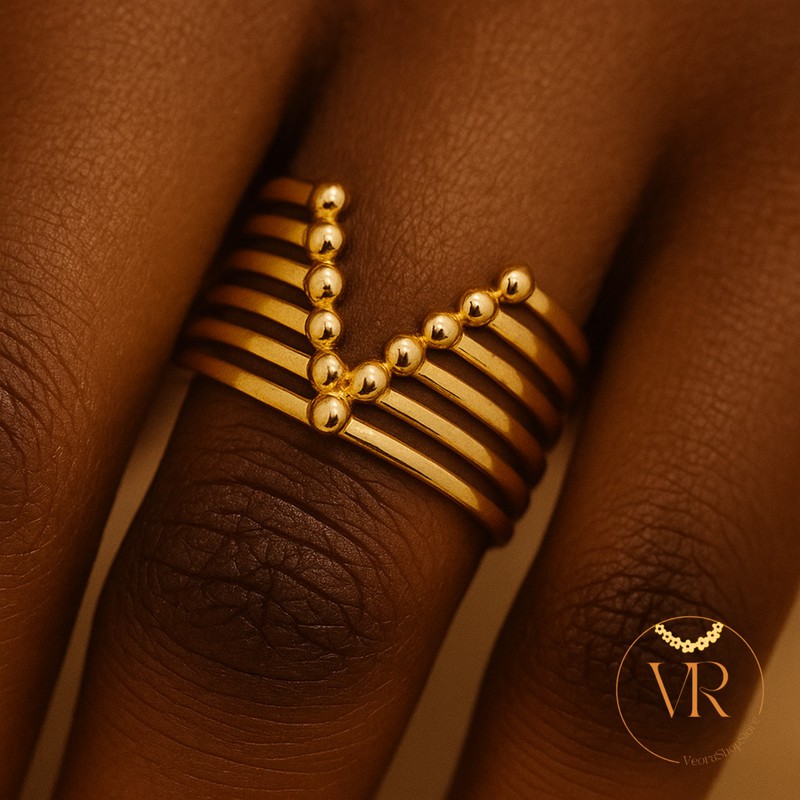 La bague « Éclat Royal » est un bijou lumineux et sophistiqué, pensé pour mettre en valeur vos mains avec élégance. Son design en forme de « V » orné de petites perles dorées apporte un éclat royal et moderne, tout en conservant un style raffiné et féminin. Une pièce qui tient le regard et donne instantanément du caractère à ton look. ⸻ ✦ Détails du produit • Type : Bague dorée • Vendu à l'unité • Taille : Ajustable • Matériau : Acier inoxydable doré (résistant à l'eau & à la fabrication) • Poids : 4,2 g • Dimensions : • Hauteur : 1,8 cm • Largeur : 1,2 cm • Finition : Or brillant + détail perlé texturé • Hypoallergénique – sans nickel ⸻ ✦ Points forts • Design unique, féminin et élégant • Résiste à l'eau – ne ternit pas et ne noircit pas • Ajustable pour un confort parfait • Légère & agréable à porter • Fait partie de la collection VeoraShopStore Signature ✨ ⸻ ✦ Style & occasions Idéale pour un look chic au quotidien ou pour sublimer une tenue lors d'un évènement. À porter seule pour un effet « déclaration », ou combinée avec d'autres bagues dorées pour un look tendance stacking.