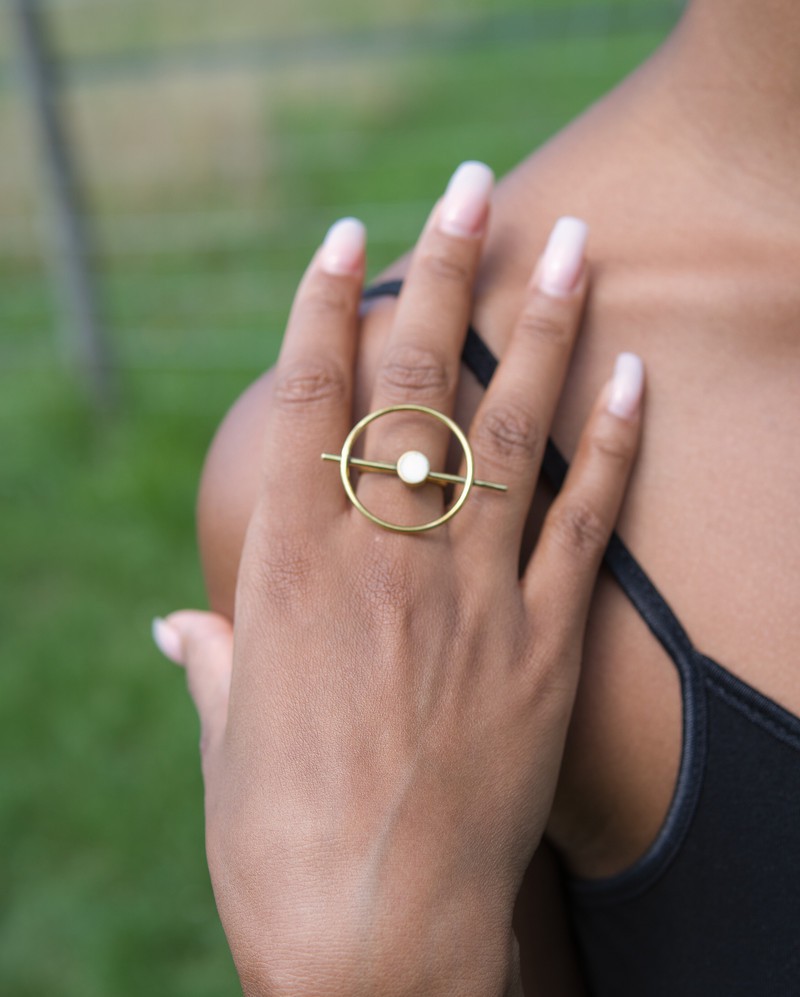 Symbole d'harmonie et de force intérieure, cette bague ajustable en laiton se distingue par sa forme circulaire épurée, traversée d'une fine barre centrale. En son cœur, un point blanc en os naturel apporte une touche organique et lumineuse, rappelant le lien entre la matière brute et la pureté de l'esprit. Une pièce minimaliste et puissante, parfaite pour sublimer votre aura avec élégance. Matériaux : Laiton brut & os naturel Finition : Poli satiné Fabrication : Fait main avec amour – chaque pièce est unique