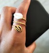 Un cauris naturel incrusté et un cauris ou qui s'entrelacent avec finesse et élégance. Sobre tout en restant chic c'est une bague à porter en toutes circonstances. En acier inoxydable, traité sans nickel pour le respect de votre peau, l'anneau est réglable pour s'adapter à toutes les tailles. *ENVOI RAPIDE AVEC SUIVI POSTAL* Emballées sous papier de soie et sachet d'organza le tout expédié dans une enveloppe bulle pour une protection maximale de votre commande.