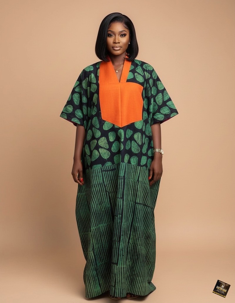 This sophisticated boubou maxi dress is a stunning fusion of traditional artistry and modern chic, expertly crafted from premium, hand-dyed Adire cotton that provides a rich texture and effortless, airy drape. The garment showcases a captivating dual-pattern design, featuring an organic green pebble motif against a black backdrop on the upper bodice, which seamlessly transitions into a structured vertical stripe pattern along the lower half for a lengthening effect. A bold, vibrant orange crepe bib adorns the neckline, creating a striking focal point that complements the earthy tones of the dress, while the wide kimono sleeves offer a glimpse of a added touch of luxury. This ensemble is the perfect statement piece for art gallery openings, high-profile cultural events, or festive holiday gatherings, ensuring a look that is both authoritative and exceptionally comfortable.