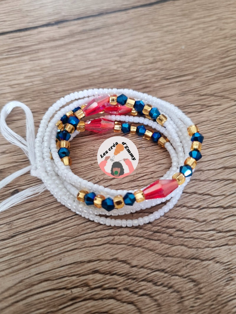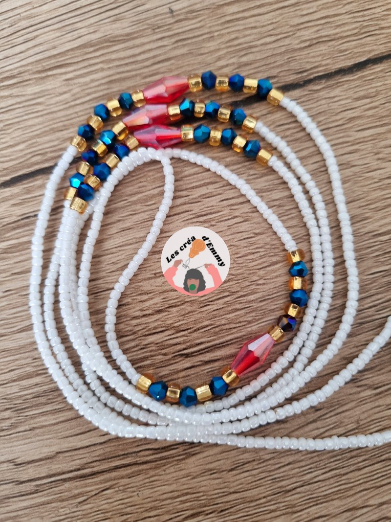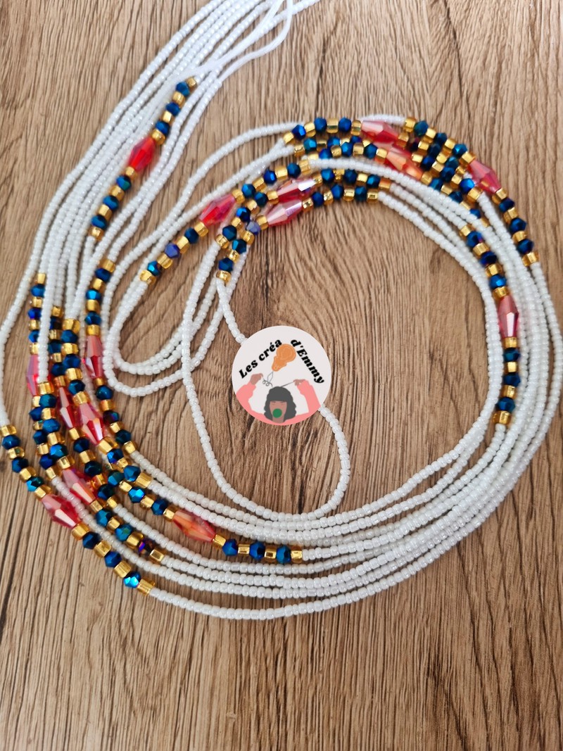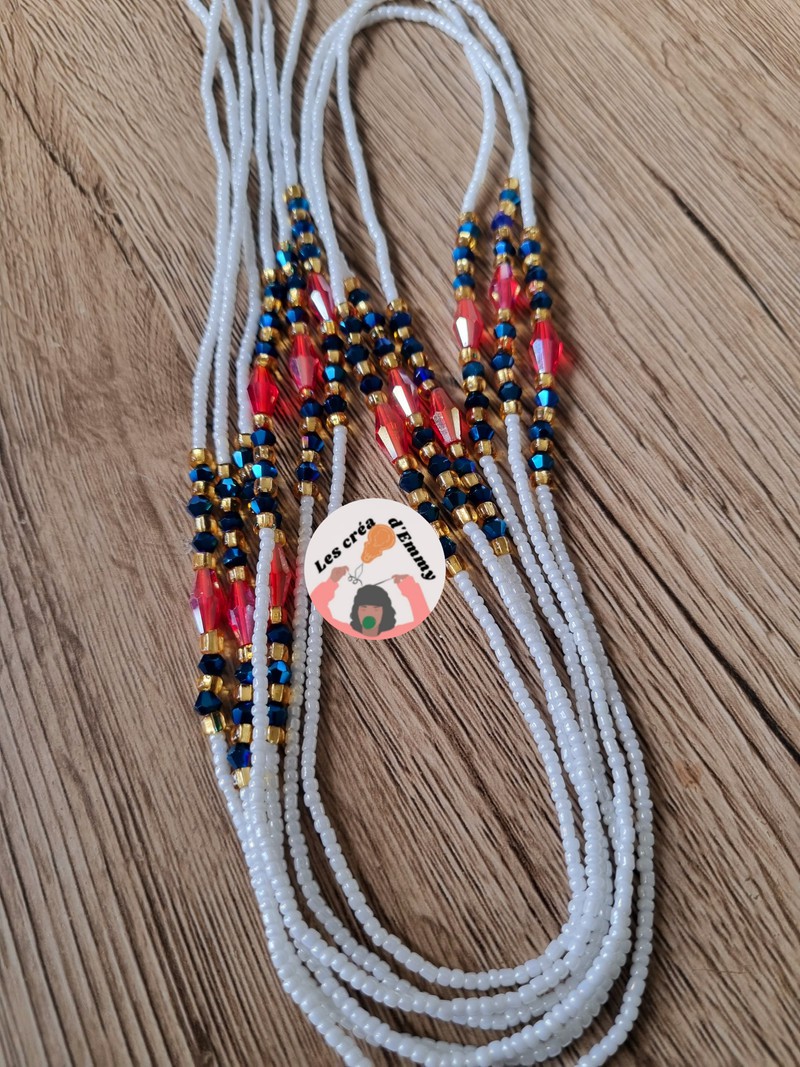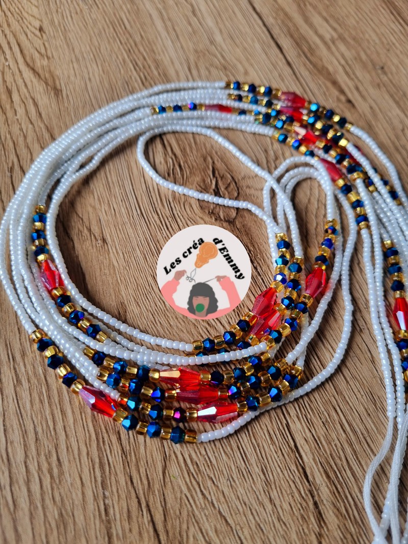 les créa d'Emmy proposent ce magnifique baya modèle Fitaa portez en plusieurs pour un effet waouh, sobriété et élégance. Couleur : Blanc, Rouge et doré Quantité : 1 collier Type d'attache : fil Longueur: 110cm ***Les bijoux sont créés en taille L *** si vous souhaitez une taille plus petite ou plus grande, merci de le lors de préciser de l'achat SVP. Pour cette raison je ne propose PAS d'échange !! ###Modification possible### -fermoir = 2€ -taille plus de 120cm =2€ -taille plus petite = GRATUIT - autre couleur = GRATUIT -fil élastique = GRATUIT Merci de m'envoyer un message pour toute modification avant paiement SVP Petit conseil : Mesurez votre tour de taille ou de hanches afin d'être sûr lors de votre choix. Guide des tailles(taille de pantalon et tour de taille) : 34 : 75 cm 36 : 80 cm 38 : 90 cm 40 : 100 cm 42 : 105 cm 44 : 110 cm 46 : 115 cm 48 : 120 cm 50 : 125 cm 52 : 130 cm Pour autre taille, contactez-moi par message. !!Une photo des créations personnelles vous est toujours envoyée pour validation avant expédition!! les colliers de reins aussi appelés: bine-bine, baya, waistbeads, les perles de taille, bayas, sont des bijoux portés par les femmes depuis des générations. Elles sont utilisées à différentes fins, mais surtout, comme accessoire de séduction. On peut en porter un seul ou plusieurs pour agrémenter un ensemble de lingerie, un maillot de bain ou encore par dessus un vêtement, en tant que ceinture. INSTAGRAM : les créa d'emmy