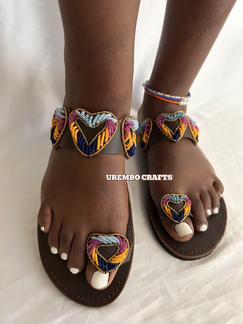Product Name: Handmade Beaded Leather Sandals – Heart Design Brand: Urembo Crafts Product Description: Step into elegance and culture with these Handmade Beaded Leather Sandals from Urembo Crafts. Skillfully crafted by local artisans, these sandals feature a stunning heart-shaped beadwork design in vibrant multicolor patterns, representing African heritage and style. Each pair is made using high-quality, durable leather for long-lasting comfort and support. The intricate beadwork is carefully hand-stitched to ensure uniqueness and attention to detail, making every sandal one of a kind. Perfect for casual wear, beach outings, summer events, or adding a touch of tradition to your modern look. Key Features: 100% genuine leather sole and straps Beautiful multicolored heart-shaped bead design Soft and comfortable inner lining for all-day wear Handmade by skilled Kenyan artisans Available in various sizes Lightweight and flexible for everyday comfort Care Instructions: Wipe clean with a soft, damp cloth Avoid prolonged exposure to water
