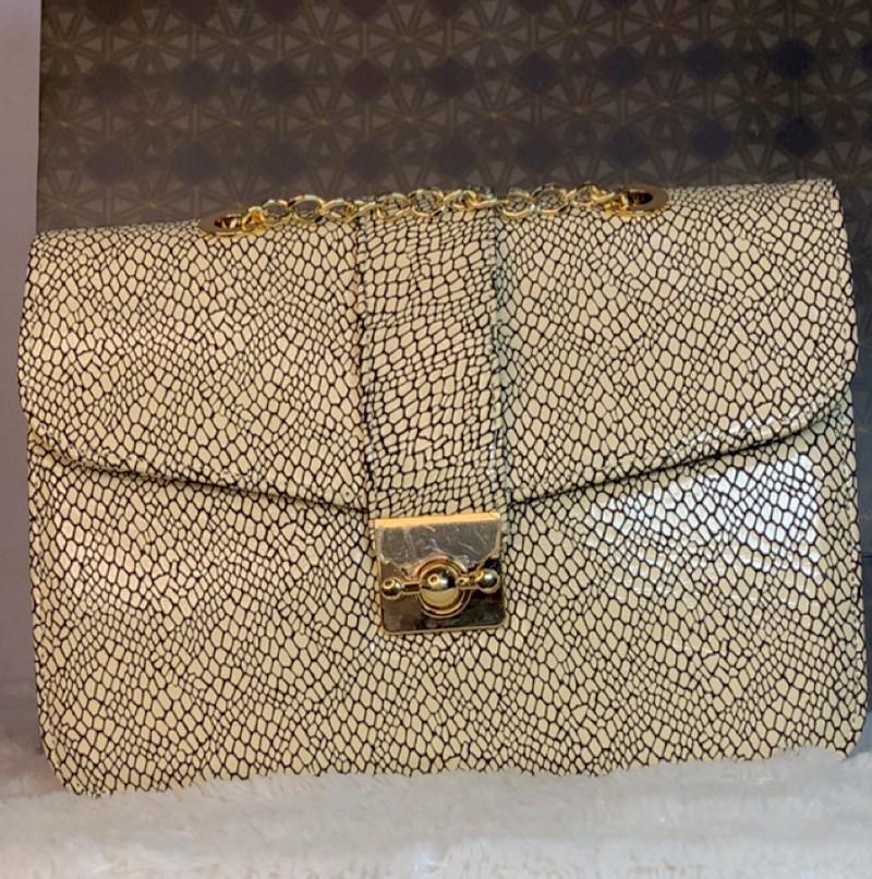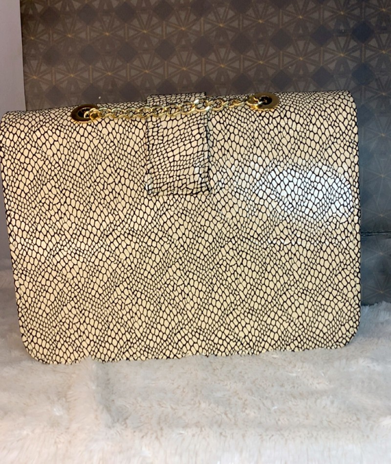 Elevate your look with this beige textured leather bag, adorned with a chic reptile inspired and pattern and polished gold tone hardware. Designed with a versatile chain strap, it blends classic sophistication with contemporary style, making it the perfect accessory for both casual outings and special occasions. Compact yet spacious enough for essentials like a phone, keys, and lipstick, its ideal for both casual daytime and outings and elegant evening events.