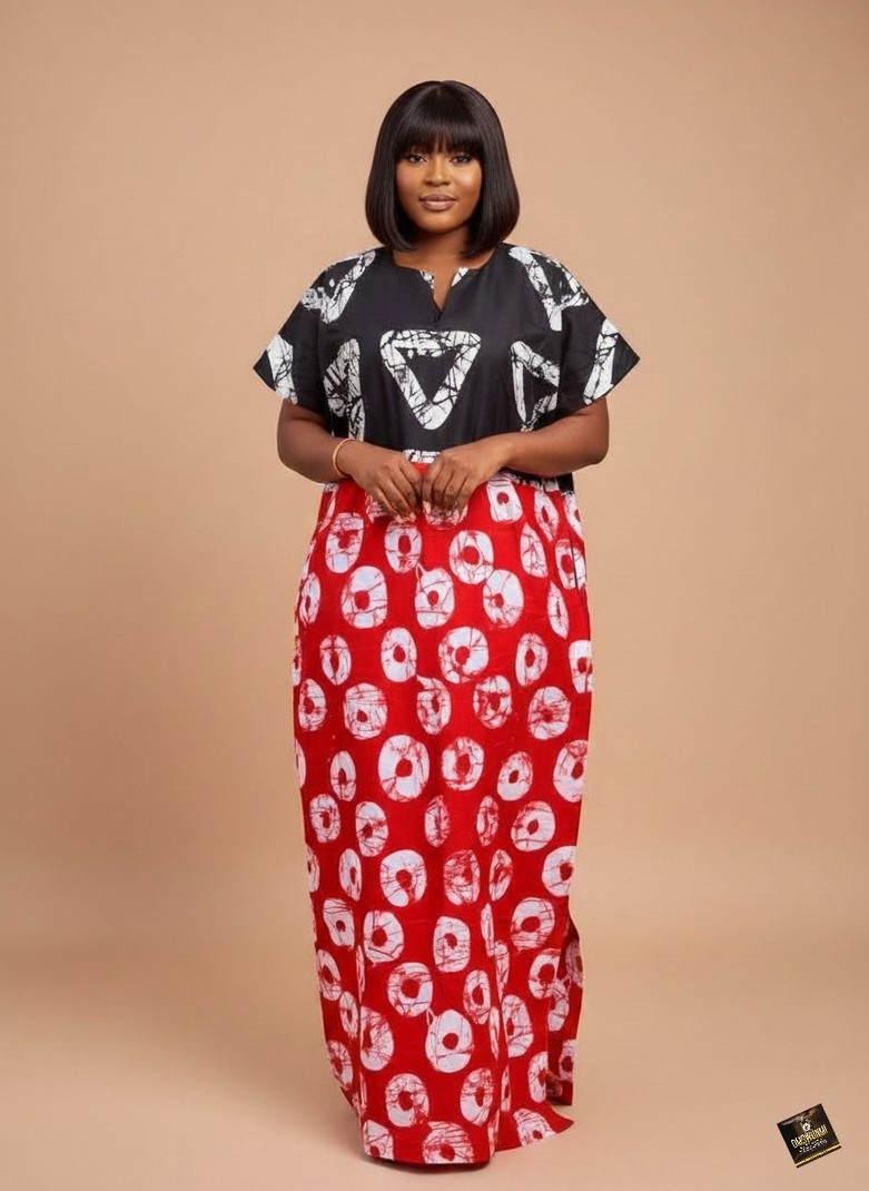 This striking floor-length maxi dress is masterfully crafted from premium hand-dyed Adire cotton, featuring a bold and artistic color-block design that perfectly balances modern style with traditional West African textile heritage. The garment is visually divided into a sleek black upper bodice adorned with white geometric triangle motifs and a vibrant red lower skirt featuring intricate white ring patterns. Its relaxed, short-sleeved silhouette and split neckline provide a comfortable yet sophisticated drape that is both breathable and high-impact. This dress is an ideal choice for high-end cultural events, creative professional gatherings, or upscale evening dinner parties where you want to radiate confidence and unique elegance.
