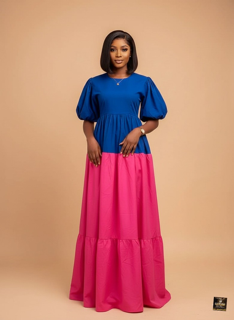 Make a bold and feminine statement with this stunning two-toned maxi gown, an exquisite piece that blends modern color-blocking with a timeless silhouette. Meticulously crafted from premium polished cotton, this dress offers a smooth, high-sheen finish that is both breathable and structured, ensuring it holds its beautiful volume throughout the day. The design features a sophisticated royal blue bodice with a classic round neckline and dramatic puff sleeves, transitioning into a vibrant magenta-pink tiered skirt that adds a playful yet regal touch. This elegant ensemble is the ideal choice for high-profile garden weddings, milestone birthday celebrations, or sophisticated evening soirées, offering a vibrant and polished look that pairs perfectly with simple gold jewelry and neutral-toned heels.