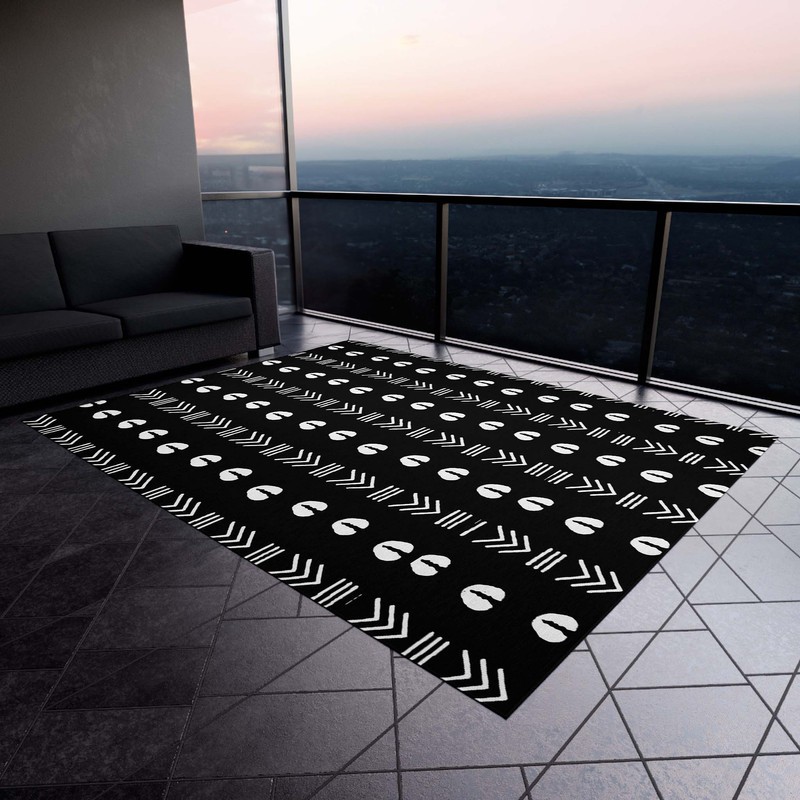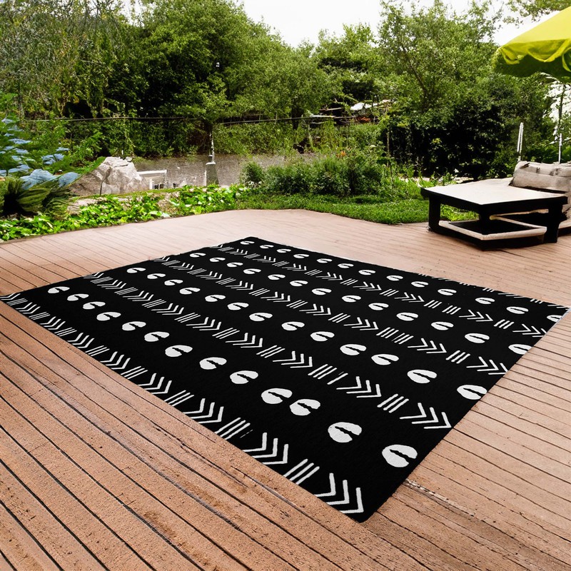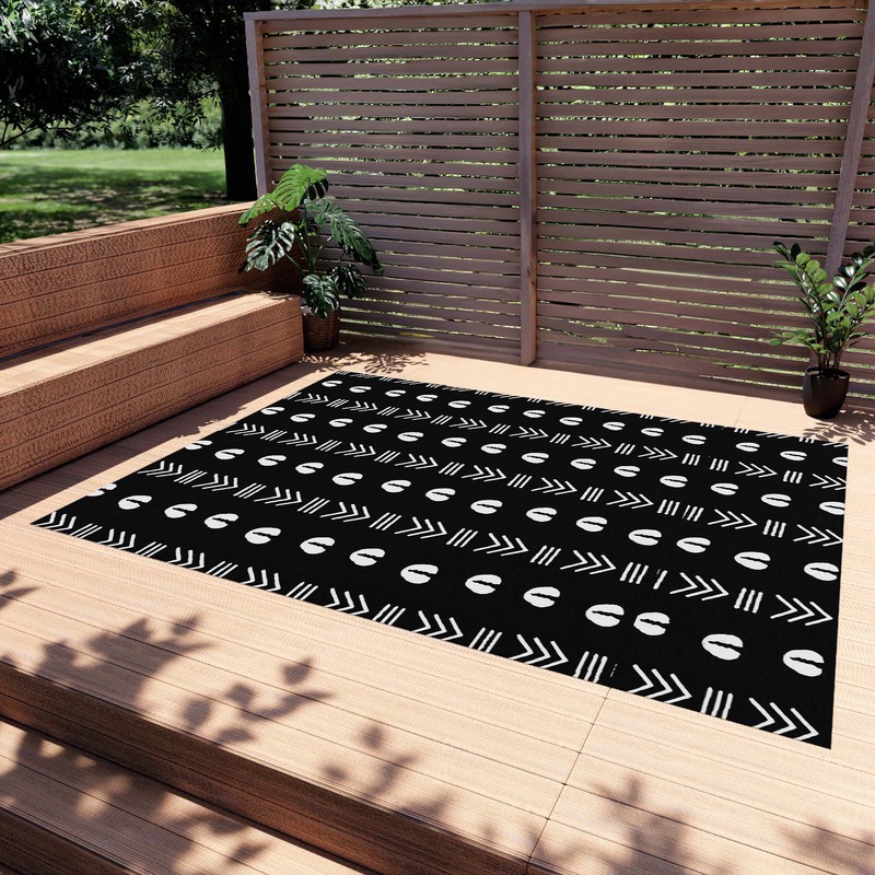 Embrace the wild side with this bold Black and White Carpet African Cowrie Tribal Outdoor Rug. Its tribal design and durable construction make it perfect for adventurous outdoor spaces. Stand out from the herd and add a touch of risk-taking to your decor!