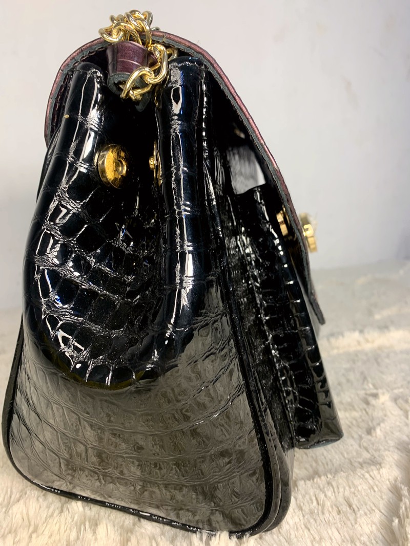 Luxury Glossy Black Crocodile- Embossed Shoulder Bag With Deep Burgundy Flap Accent: Turn heads with this bag, crafted in high-shine black patent faux leather featuring an exquisite crocodile- embossed texture. This structure handbag is finished with a secure gold- tone-lock, closure and matching chain accents. offering both style and security.