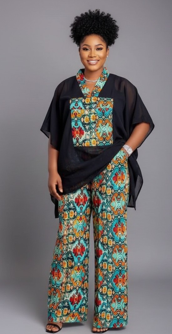 Make a bold yet elegant statement with this sophisticated two-piece set, designed for women who love effortless style with a touch of artistry. The outfit features a flowing black sheer overlay top with a patterned front panel and matching collar detail, creating a refined contrast against the vibrant multicolor print.